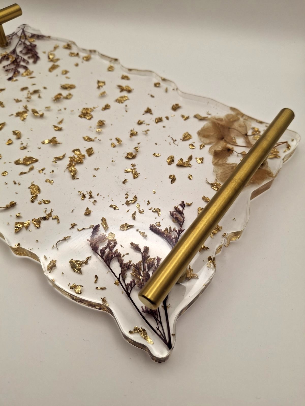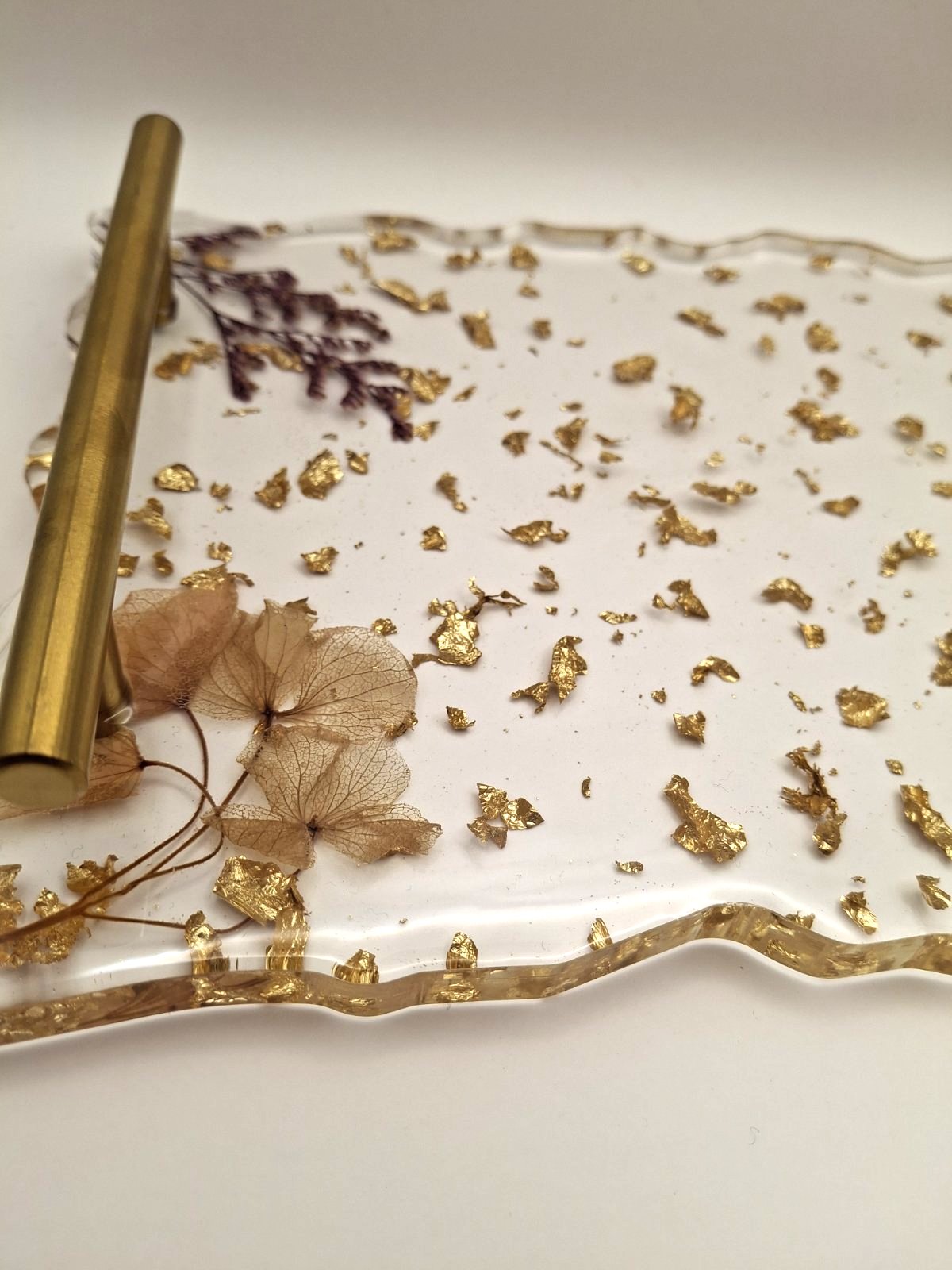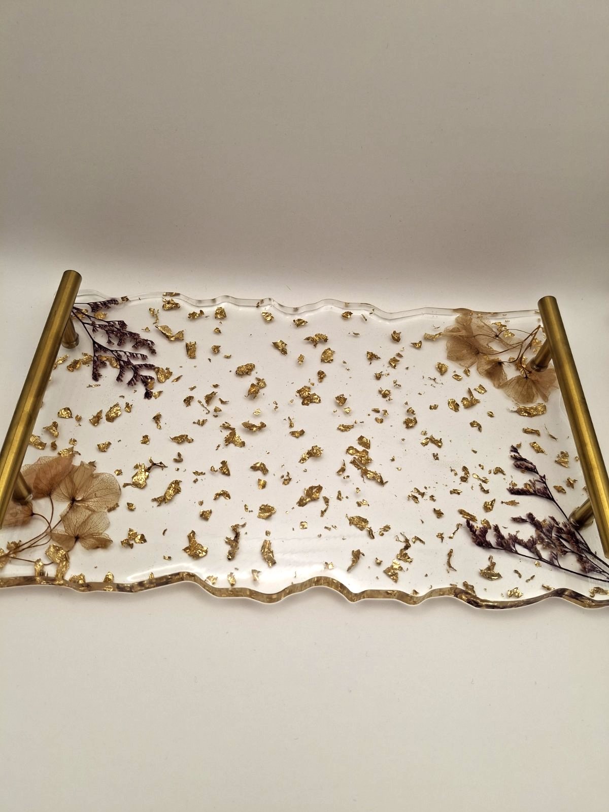 Ο χειροποίητος δίσκος γάμου από υγρό γυαλί συνδυάζει απλότητα και λειτουργικότητα, χωρίς να υπερβαίνει τα όρια της διακριτικής κομψότητας. Κατασκευάζεται στρώση-στρώση με διάφανο υγρό γυαλί υψηλής ποιότητας, μέσα στο οποίο ενσωματώνονται φυλλαράκια χρυσού και διακριτικά αποξηραμένα άνθη. Οι άκρες του διαμορφώνονται με μια ήπια, οργανική γραμμή, χαρίζοντας έναν λιτό χαρακτήρα που ταιριάζει σε κάθε στιλ διακόσμησης. Το φινίρισμά του είναι λείο και ελαφρώς γυαλιστερό, ώστε να αναδεικνύεται το φυσικό φως χωρίς έντονες αντανακλάσεις. Με διαστάσεις αρκετές για να τοποθετηθούν ποτήρια ή γλυκίσματα, αλλά όχι υπερβολικά όγκο, αυτός ο δίσκος προσφέρει μια πρακτική λύση σερβιρίσματος, χωρίς να επισκιάζει το υπόλοιπο ντεκόρ.